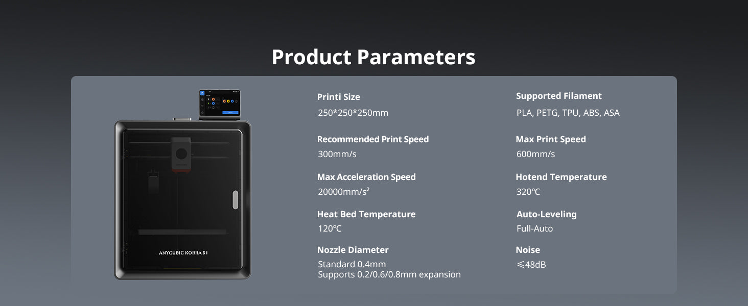 With a fully enclosed CoreXY structure and a hotbed that supports temperatures up to 320℃, the Anycubic Kobra S1 Combo can print at speeds up to 600mm/s, significantly faster than conventional models. The hotbed can maintain a maximum temperature of 120℃, making it easy to print materials like ABS, ASA, and more.