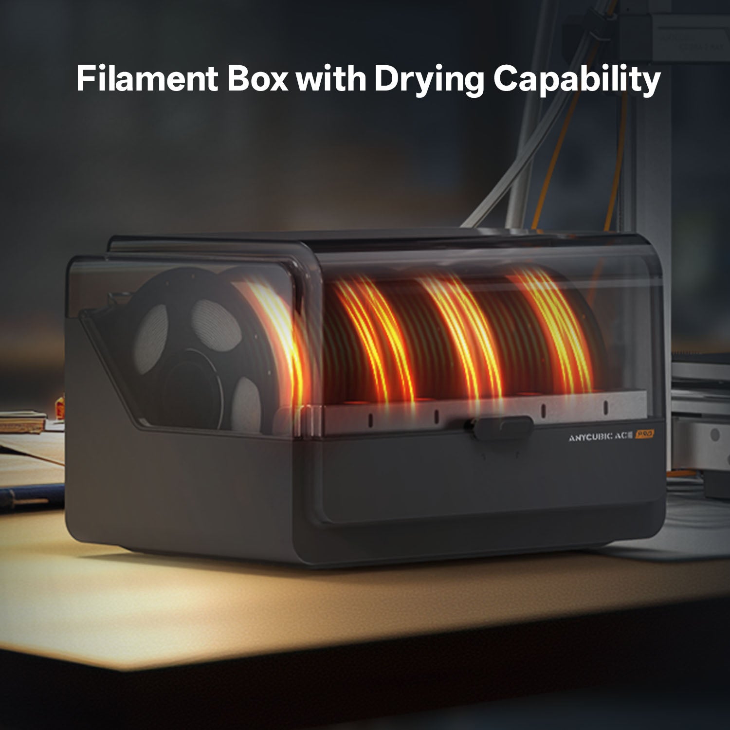 ACE Pro Multi-Color Printing System: A new innovation supporting 4-color printing (and upgradable to 8 colors) with Active Drying function, which dries filament during printing, reducing nozzle clogging and uneven print surfaces.