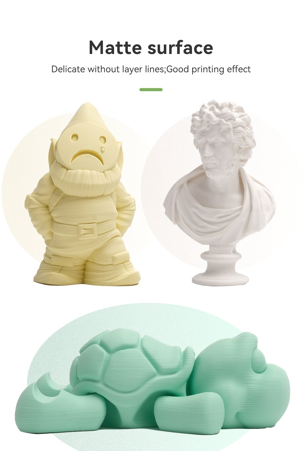 วัสดุพิมพ์คุณภาพเยี่ยมที่โดดเด่นด้วยพื้นผิวแบบด้าน วัสดุนี้มีการออกแบบสองสีที่เป็นเอกลักษณ์ แสดงให้เห็นถึงความรู้สึกของการทับซ้อนของสี ทำให้โมเดลมีพื้นผิวที่ละเอียดอ่อนและไม่มีรูปแบบเลเยอร์ที่ชัดเจนทำให้ชิ้นส่วนที่พิมพ์มีสัมผัสระดับสูง มีคุณภาพการมองเห็น เมื่อเปรียบเทียบกับ ABS แล้ว ePLA-Matte ใช้งานสะดวกกว่า ไม่จำเป็นต้องมีโครงสร้างปิดในการพิมพ์ มีอัตราการหดตัวต่ำกว่า บิดงอหรือแตกยาก ทำให้เป็นตัวเลือกที่เหมาะสำหรับการพิมพ์โมเดลขนาดใหญ่