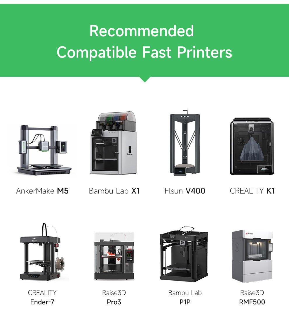 It is compatible with most FDM 3D printers, including high-speed printers such as: Bambu Lab P1P/P1S/X1/X1C/A1/A1 mini, AnkerMake M5, Creality K1/K1 Max, Voron 2.4, FLSUN V400, Prusa, UltiMaker, MK3, Ender 3/Ender 7, MakerBot, Flashforge, Raise3D.