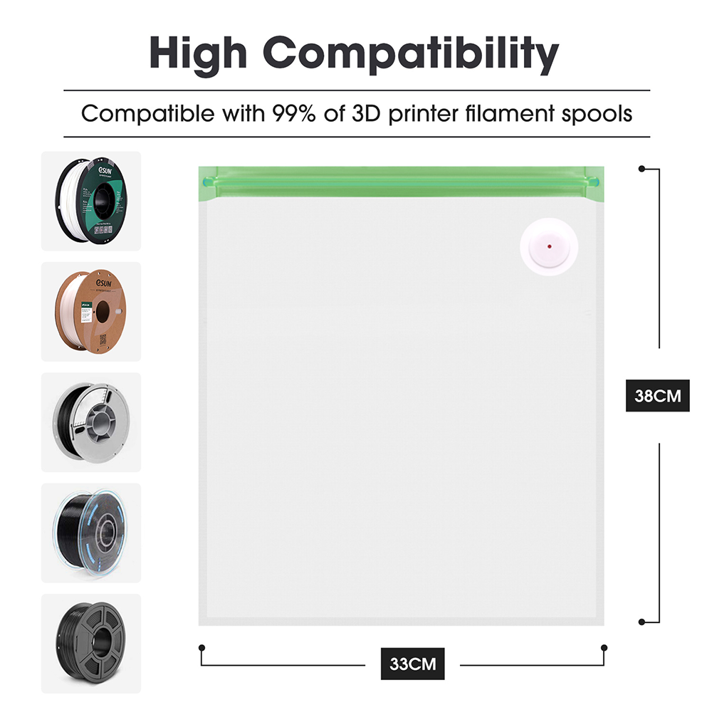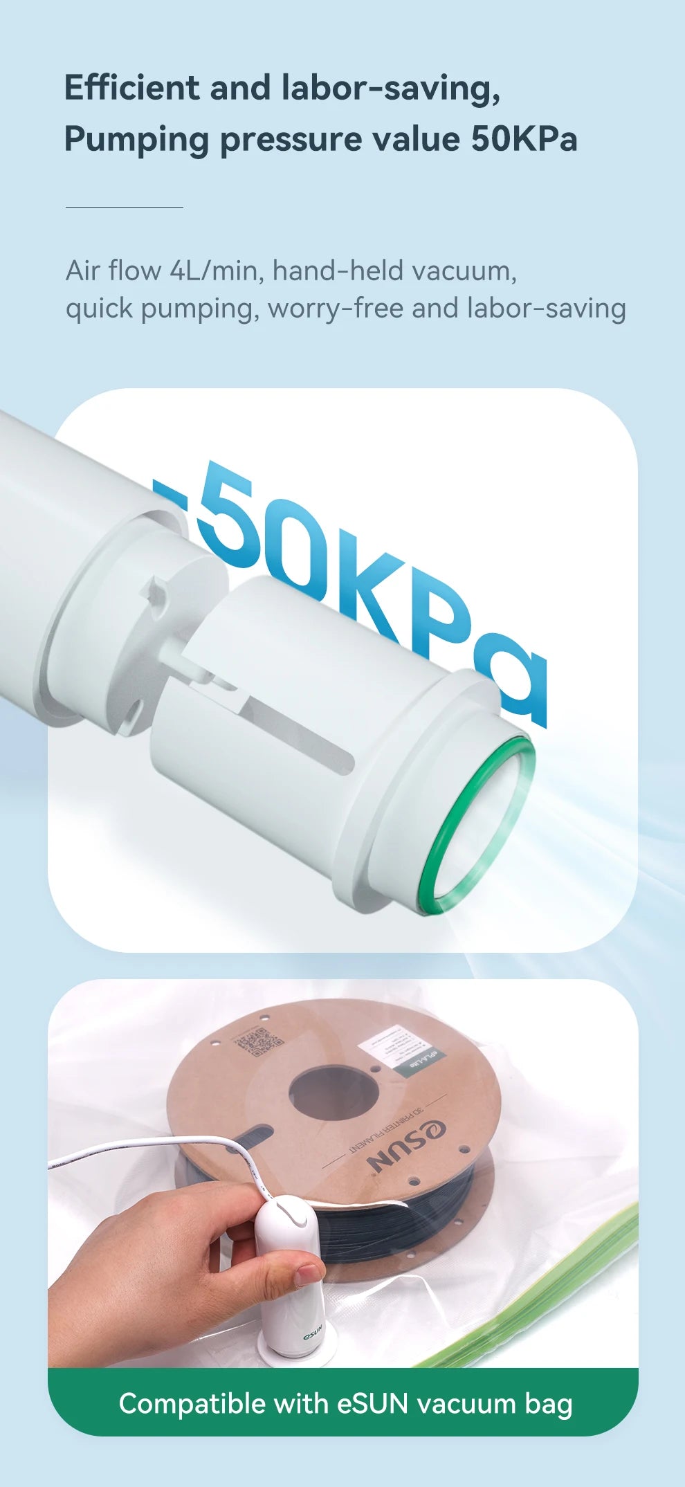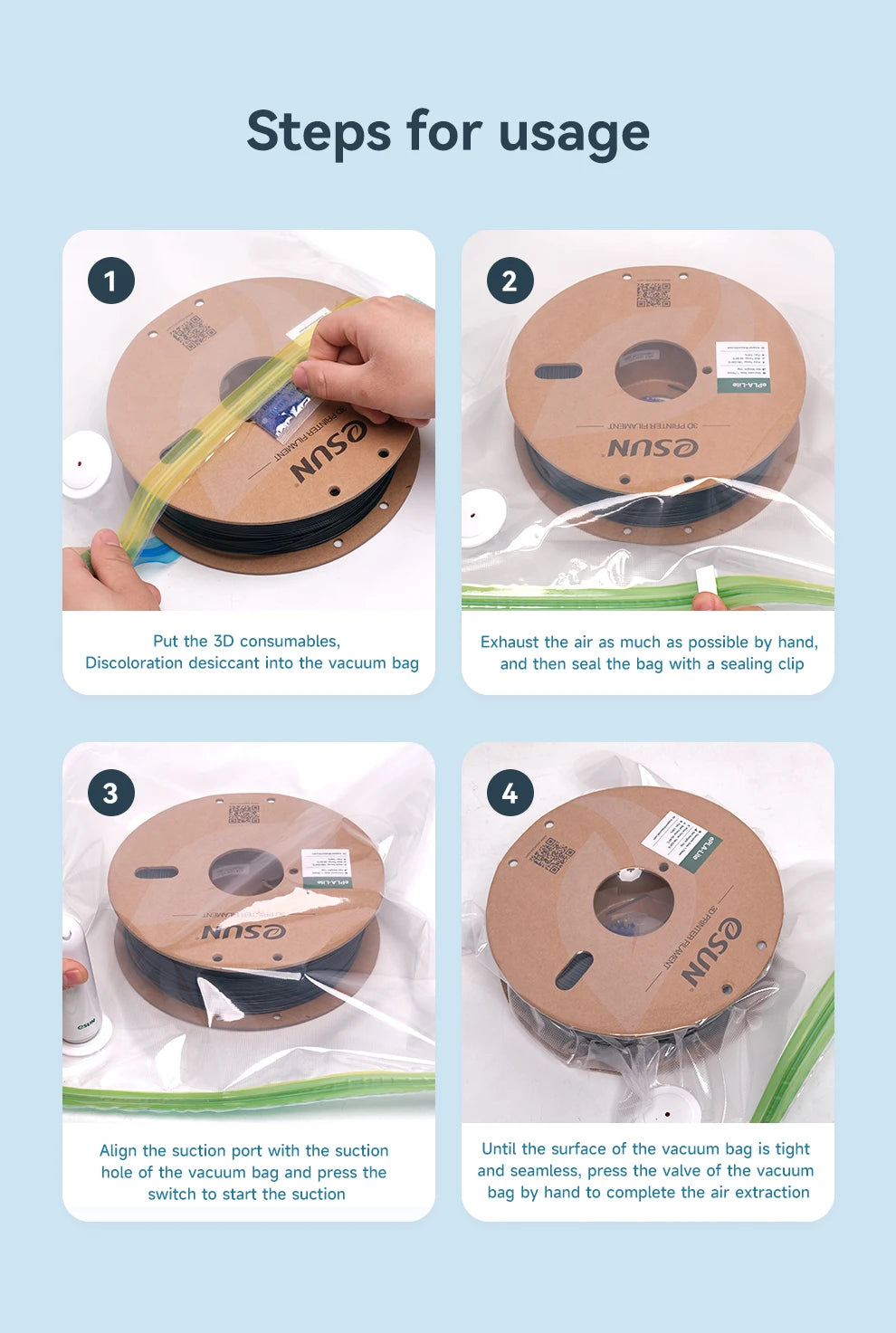 - The single-sided embossed vacuum bag design is ideal for dust protection and moisture resistance. It's suitable for filaments with high moisture absorption, such as ePA (Nylon), ePA-CF (Nylon Carbon fiber), PVA, ABSMAX, and TPU95A. Manual pumping saves time and improves efficiency.