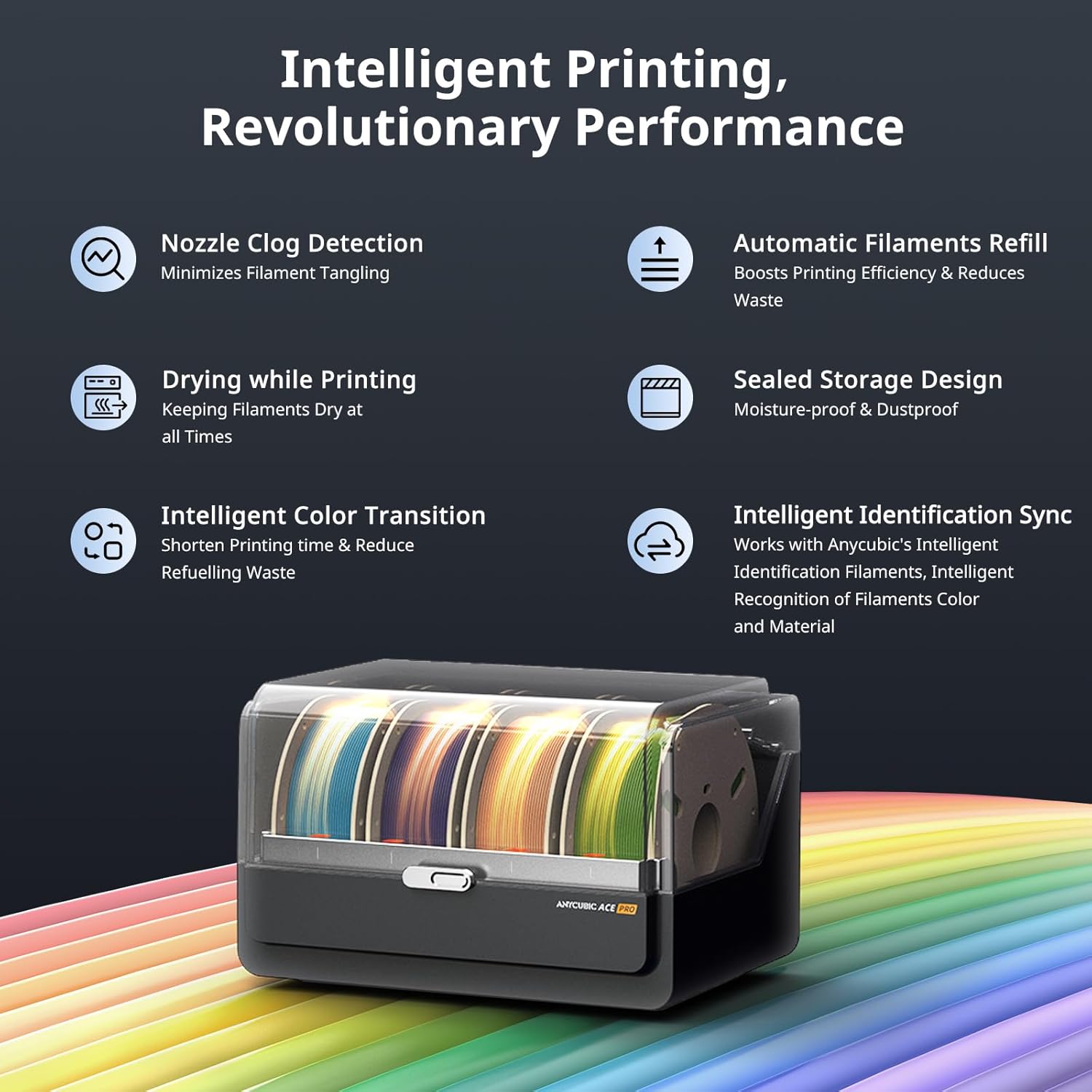 ACE Pro รองรับการตั้งค่าพารามิเตอร์ของเส้นใยล่วงหน้า โดยมาพร้อมค่าความชื้นที่ตั้งไว้สำหรับเส้นใยแต่ละประเภท เพียงคลิกเดียวก็เริ่มการพิมพ์สามมิติได้อย่างยอดเยี่ยม นอกจากนี้ยังมีระบบกลไกกันสะเทือนในตัวที่ช่วยหยุดการพิมพ์อัตโนมัติและแสดงการแจ้งเตือนเพื่อให้มั่นใจว่ากระบวนการพิมพ์เป็นไปอย่างปลอดภัย